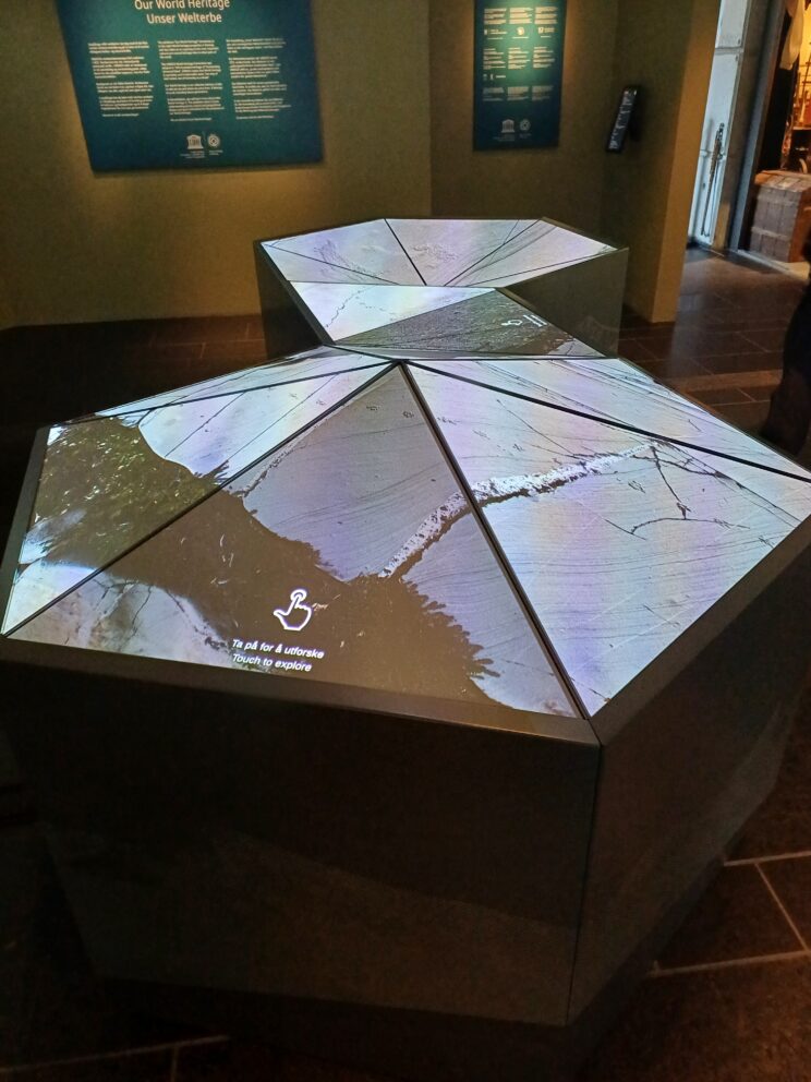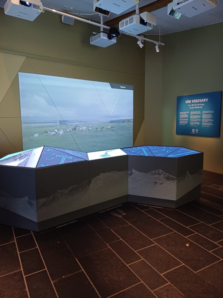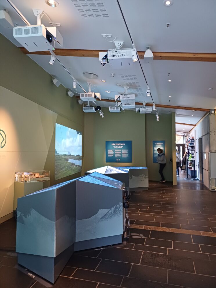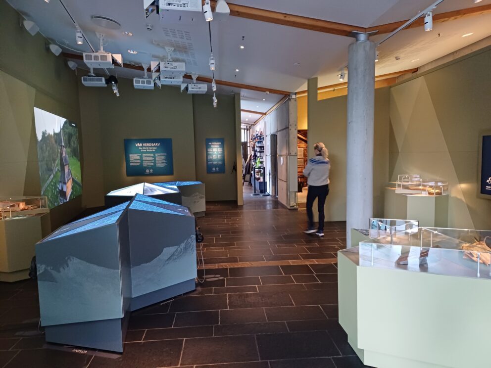 Innandørsutstillinga gjer informasjon og kunnskap om dei åtte andre verdarvstadene i Noreg.
