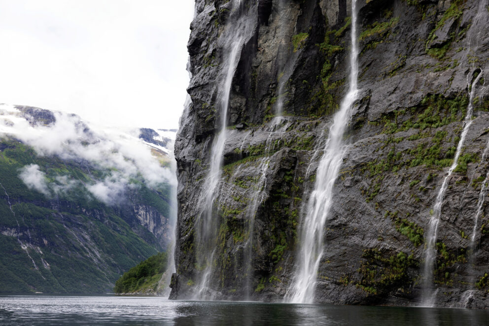 Vestnorsk fjordlandskap, Geirangerfjorden. Eit utal fossar kastar seg utfor dei stupbratte fjellveggane, medan talrike frie elver renn frå takkete fjell, brear og bresjøar, gjennom lauv- og barskog, og ned til fjorden.