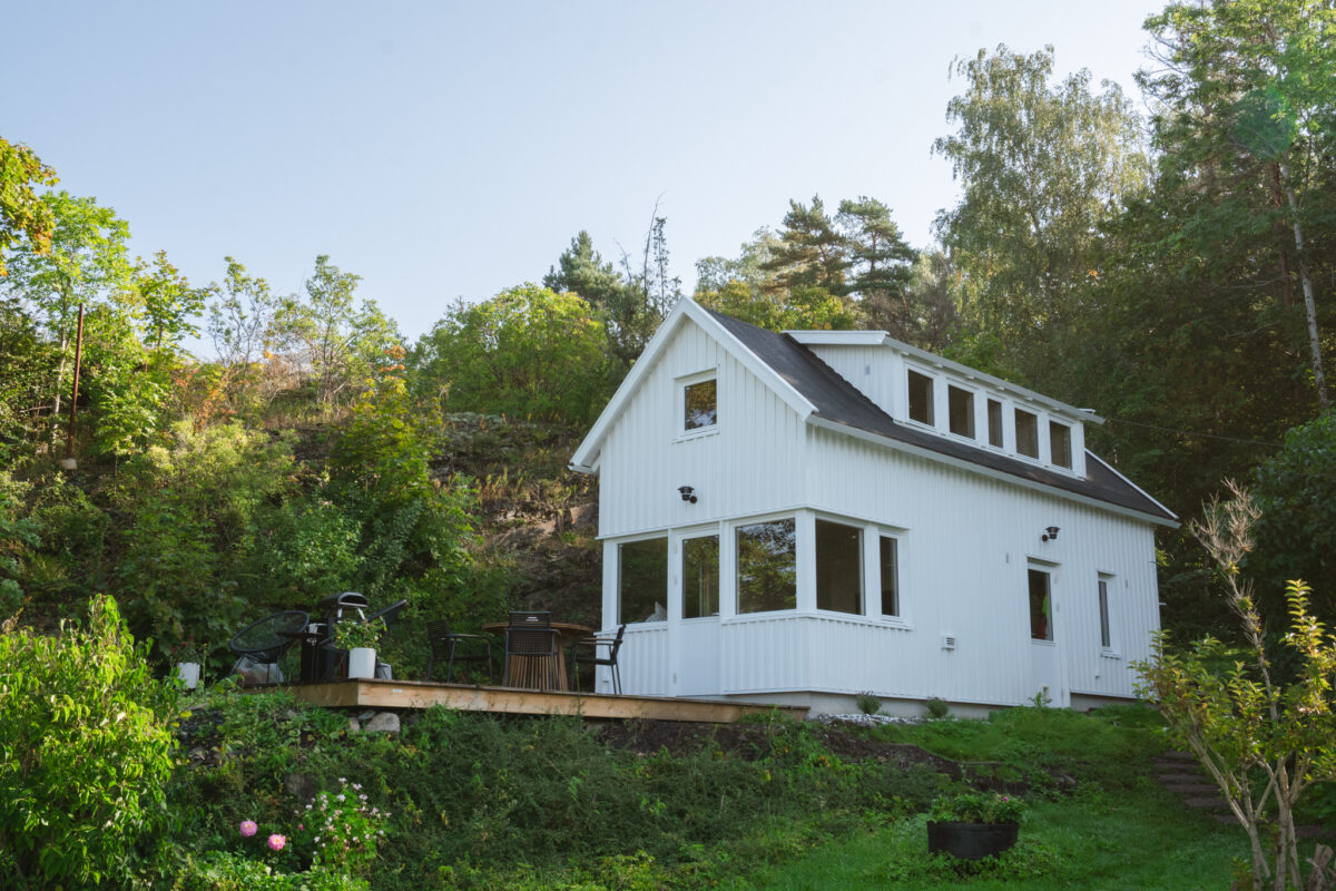 Den hvite hytta er oppført som erstatning for et anneks fra 60-tallet. Fotavtrykket er det sammen, og arkitektene har tatt utgangspunkt i bygningsmiljøet rundt da de utformet nybygget. Foto: Alexandra Gjerlaugsen