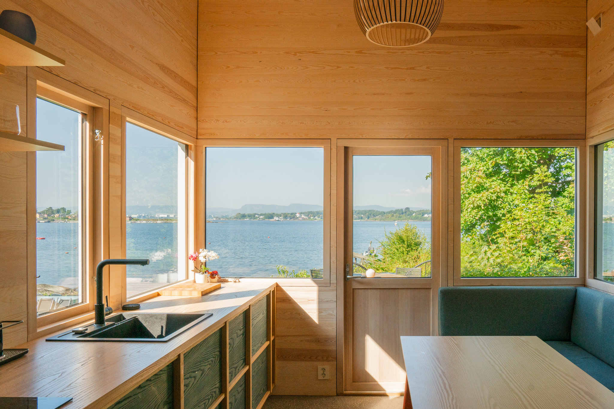 En av de originale Lindøya-hyttene har blitt satt i stand. Innvendig er det gjort endringer som optimaliserer den lille plassen. Foto: Alexandra Gjerlaugsen