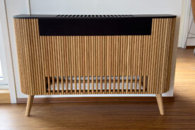Inne er det nye, reintbrennande vedomnar i kvar etasje. Saman med luft til luft varmepumpe, gir dette god oppvarming av det vesle huset. Utedelen av varmepumpa er plassert minst mogleg sjenerande, på kjellarmuren i mellomrommet mot nabohuset. Innedelen er godt innpassa i interiøret, og bidreg til å få varmen frå vedomnen betre rundt i huset. Inne på kjøkkenet er kanalen mellom utedelen og innedelen kassa inn, måla og fungerer som ei praktisk hylle.