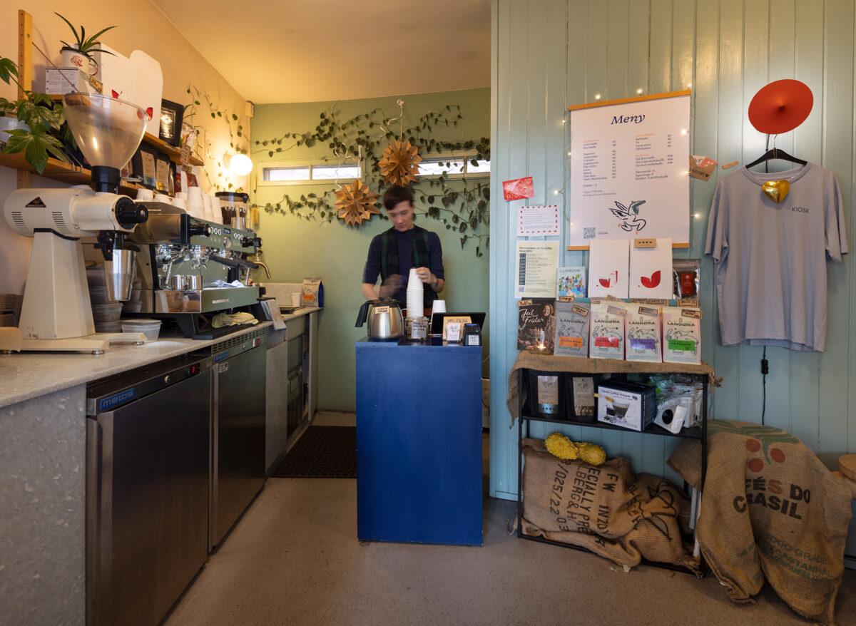 Det er investert i topp utstyr som gir svært god og presis kvalitet på kaffien. Drifta dei har lagt opp til er tilpassa både den vesle bygningen og trafikken i området, som no er meir basert på kollektivtransport og mjuke trafikkantar enn da bensinstasjonen vart bygd. Foto: Trond Isaksen, Riksantikvaren