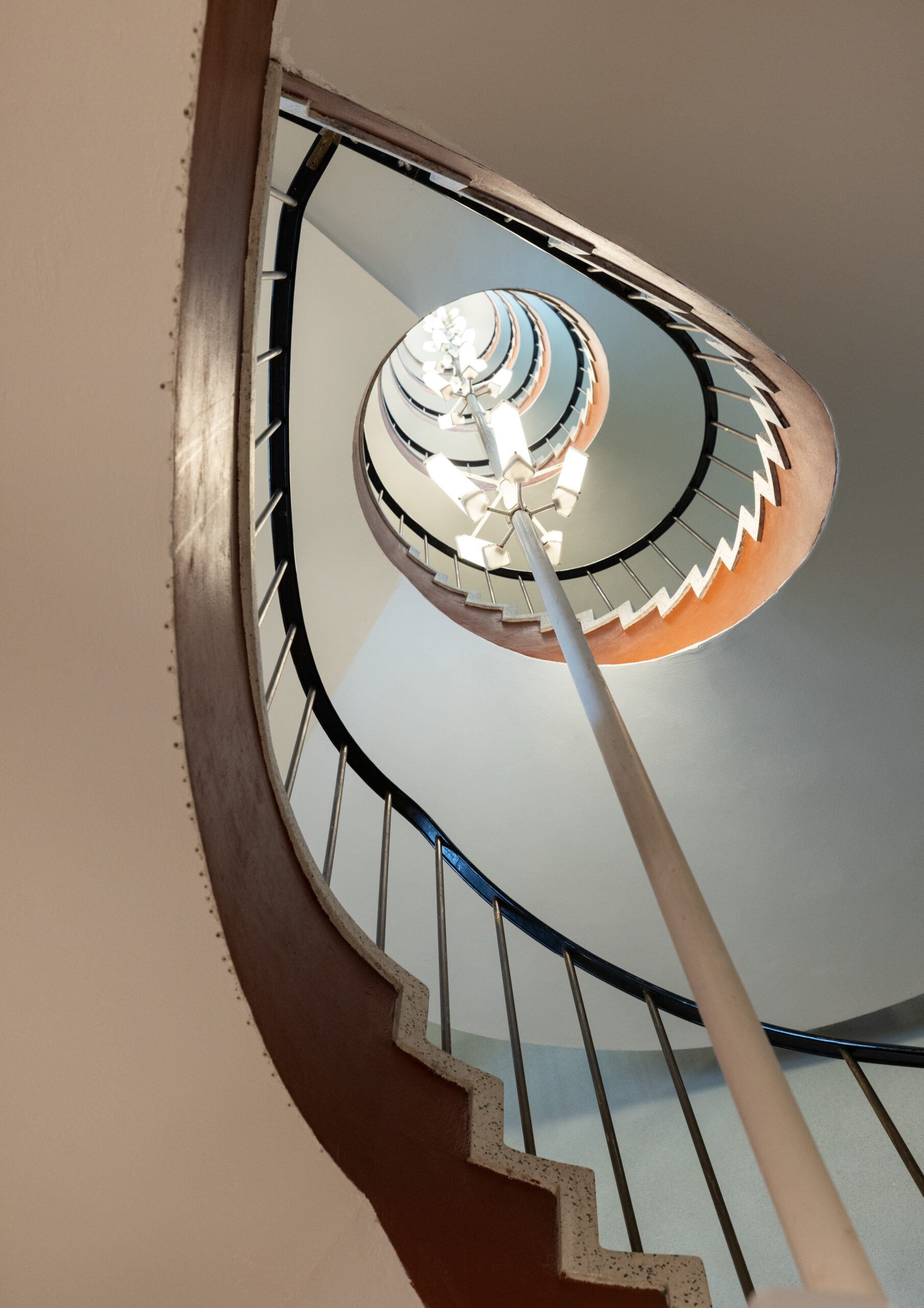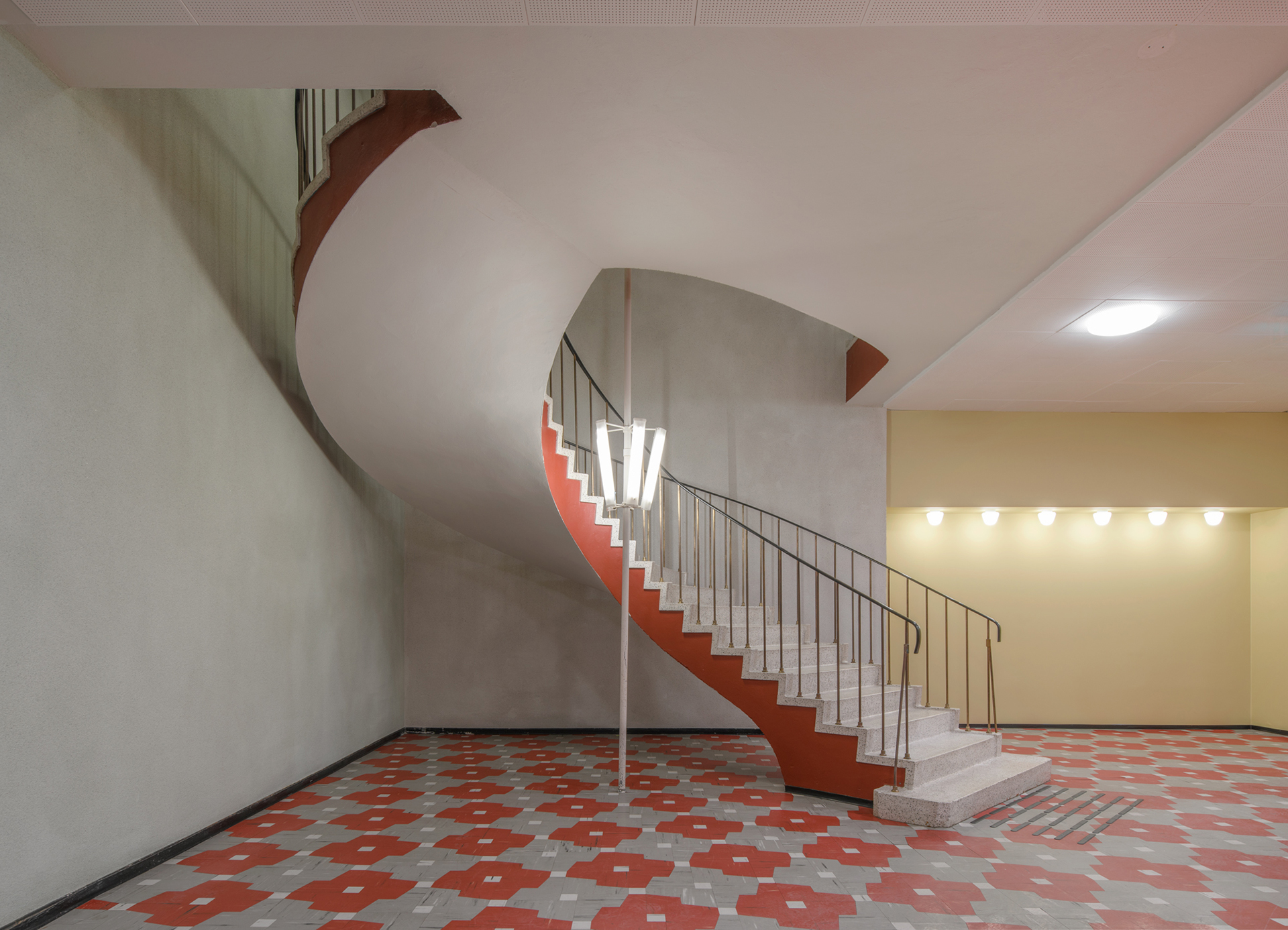 I hovudtrapperommet er trapp med rekkverk, lamper og mønstergolv i underetasjen teke vare på. Foto: Mikael Olsson, Alexandria Algard Architects
