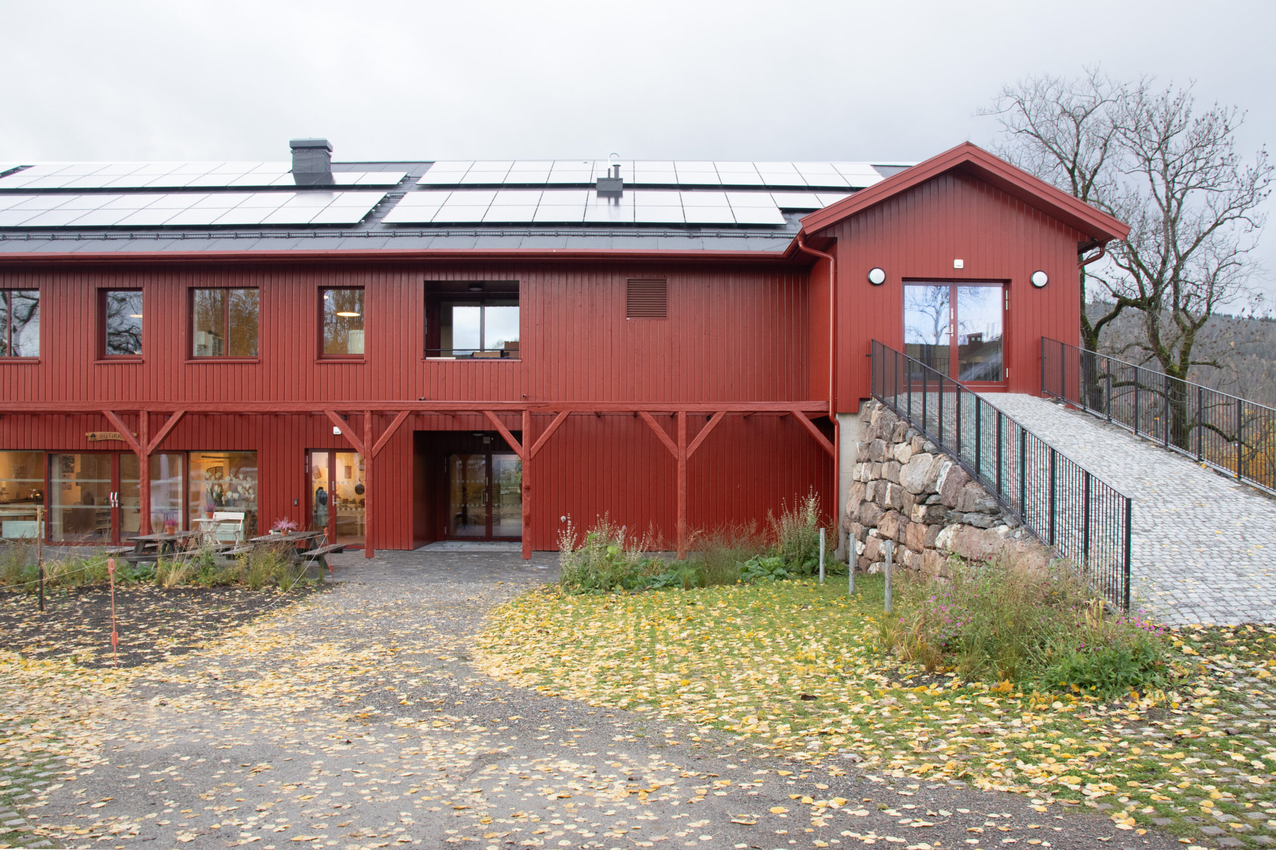 Store deler av den opprinnelige kledningen er brukt på nytt. Deler av reisverket har fått ny funksjon som pergola. Det var høye ambisjoner for å redusere plastforbruk i prosjektet, og hele låvebygningen er malt med tradisjonell linoljemaling. På taket er det lagt solceller som produserer strøm til virksomheten. Foto: Stefan Kaliski, Riksantikvaren