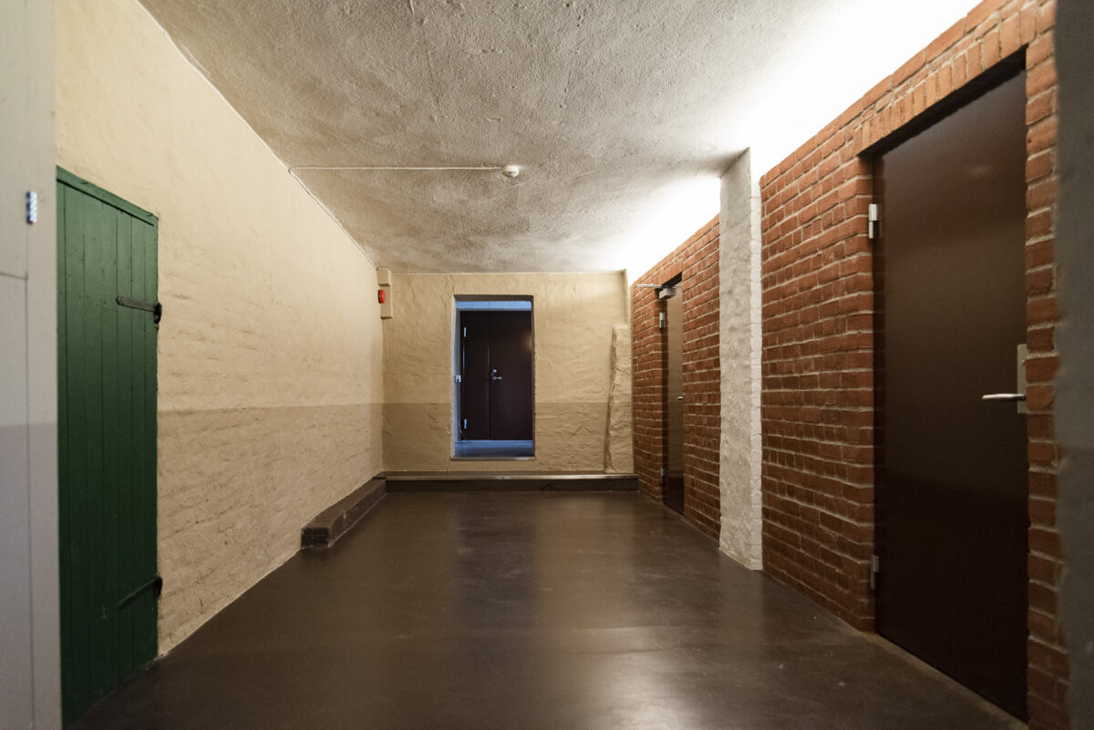Kjellerkonstruksjonen er en kistemur i naturstein, noe som gir spennende og rustikke overflater innvendig. For å dele av mellom de to toalettene og teknisk rom, er det brukt teglstein. Gulvene er utført i slipt betong, og det er brukt farger som står godt til natursteinen.
