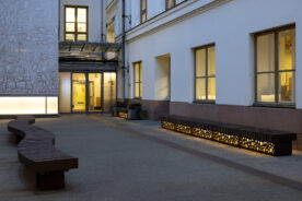 Ved hovudinngangen kjem ein raskt til heisen. Kontrastmarkeringar i svart harmonerer med rekkverket. Foto: Trond Isaksen, Riksantikvaren