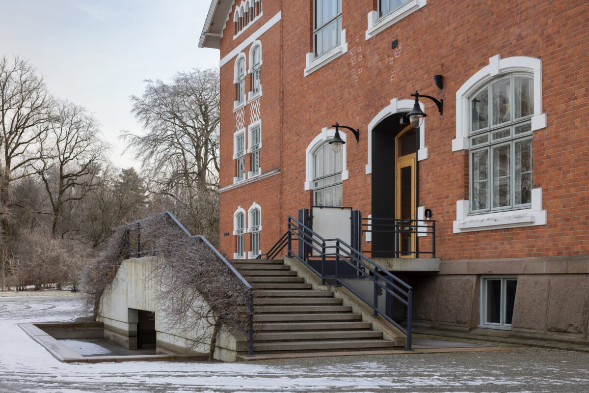 Den sentrale hovedinngangen er et viktig arkitektonisk grep med store kulturhistoriske verdier. Å etablere en trinnfri adkomst i den monumentale trappen ville ført til store endringer. For å ivareta symmetrien og det opprinnelige uttrykket i fasaden ble det skåret ut en ny døråpning på sideveggen til inngangspartiet, som også ligger på bakkeplan. Den nye åpningen er plassert inntil hovedtrappen, som bidrar til mest mulig likestilling av ulike brukergrupper.
