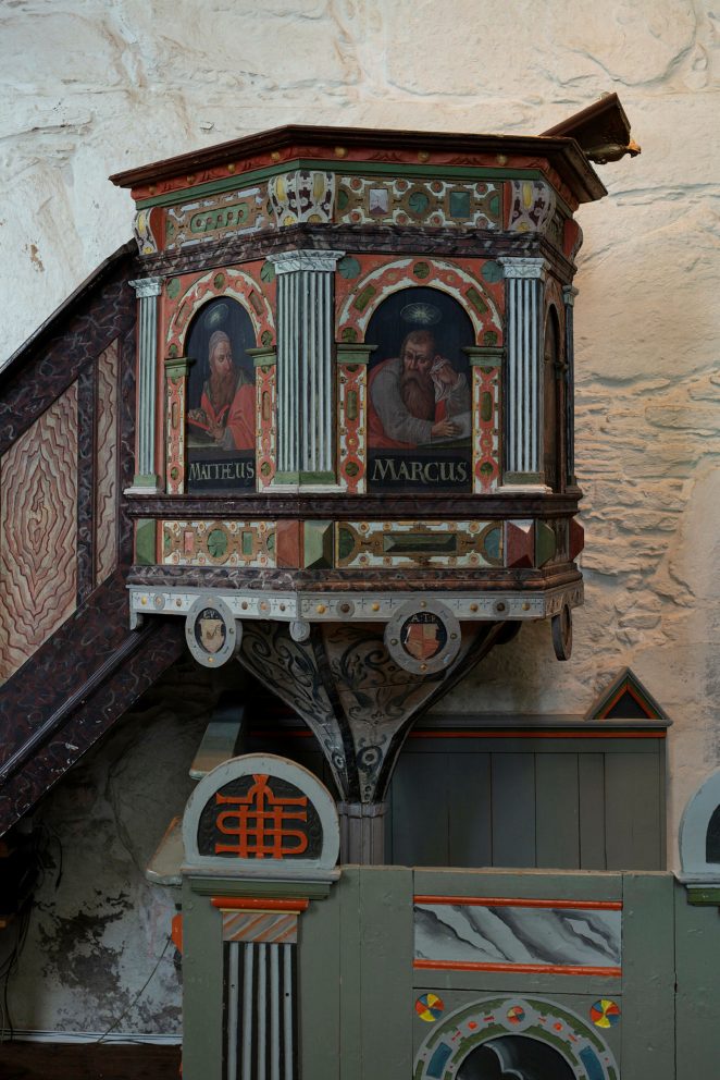Mathies tar meg med oppunder kyrkjetaket. Vi går oppå det einaste gotiske kvelvet som ein kan sjå ovanifrå i Noreg. Det er mørkt og dunkelt. Handverkarar frå Normandie lagde dette på 1200-talet. Det er imponerande konstruksjonar.